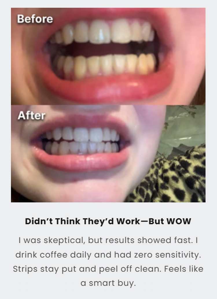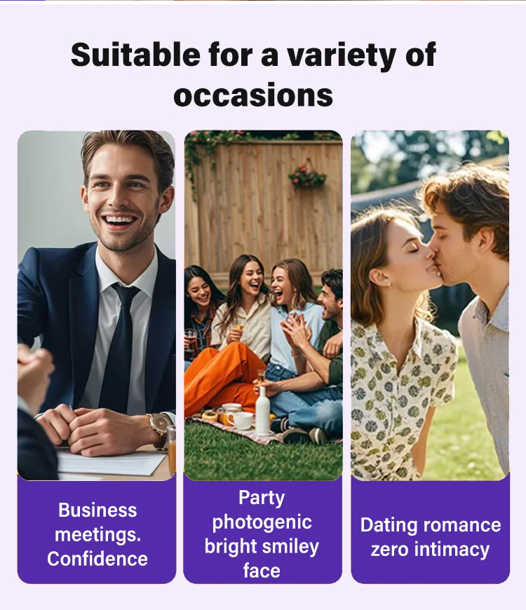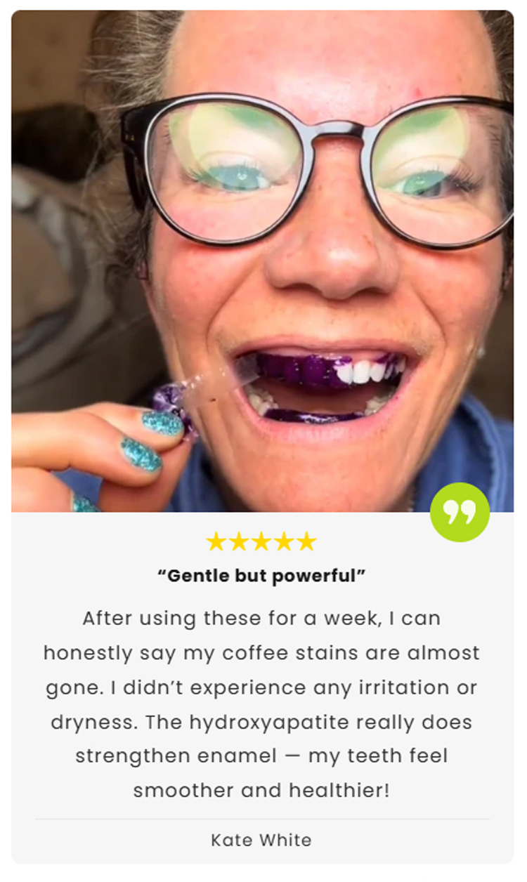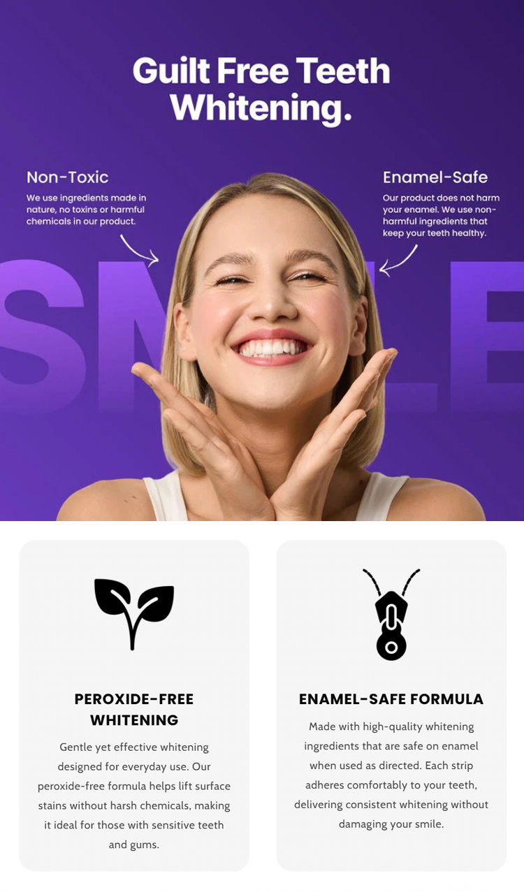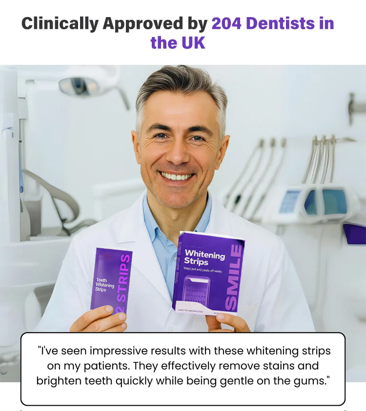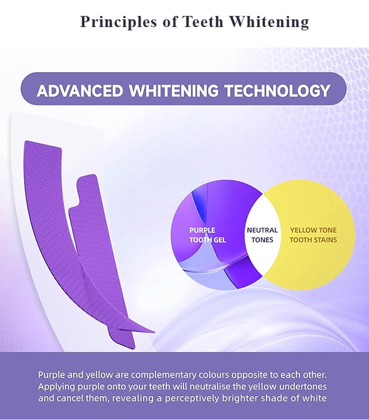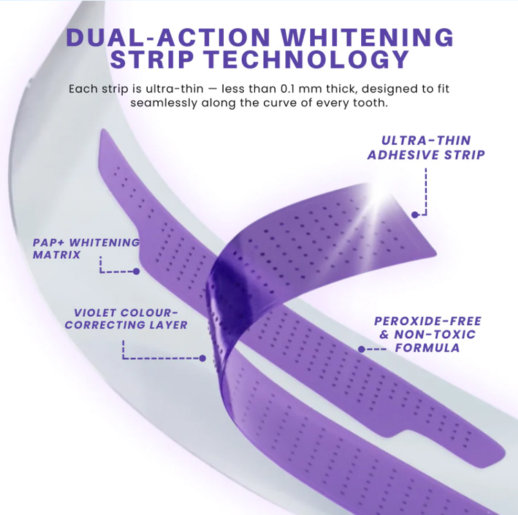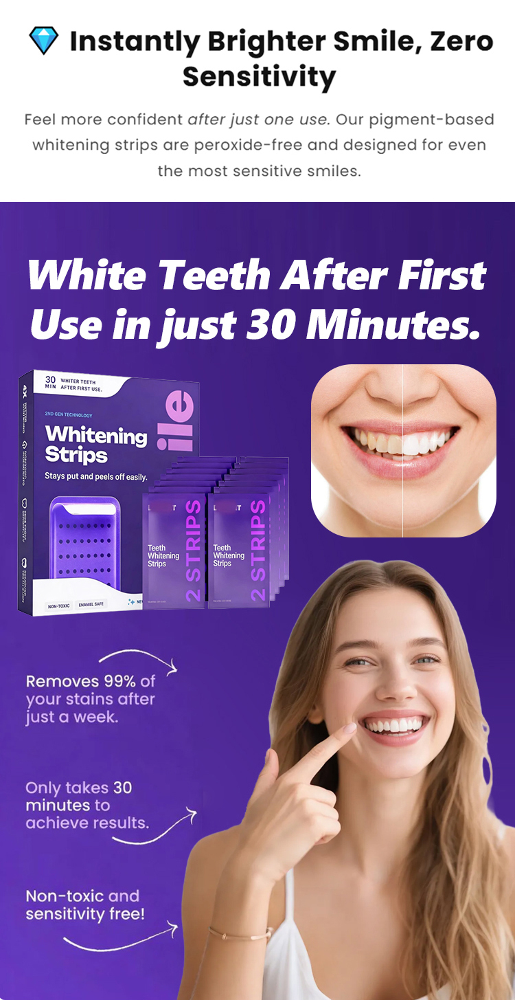 American dentists have developed second-generation purple-toned teeth whitening strips that whiten teeth in 30 minutes, remove 99% of stains in 7 days, are free of hydrogen peroxide and cause zero sensitivity, and are enamel-friendly.